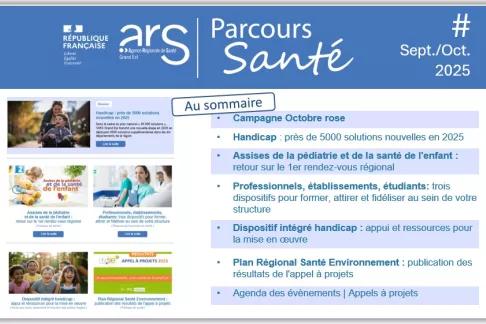 Parcours Santé est la lettre d’information électronique de l’ARS. Publiée tous les mois, elle vous propose une sélection d'informations sur l’actualité santé dans la région Grand Est.
