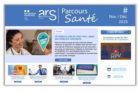 Parcours Santé est la lettre d’information électronique de l’ARS. Publiée tous les mois, elle vous propose une sélection d'informations sur l’actualité santé dans la région Grand Est.
