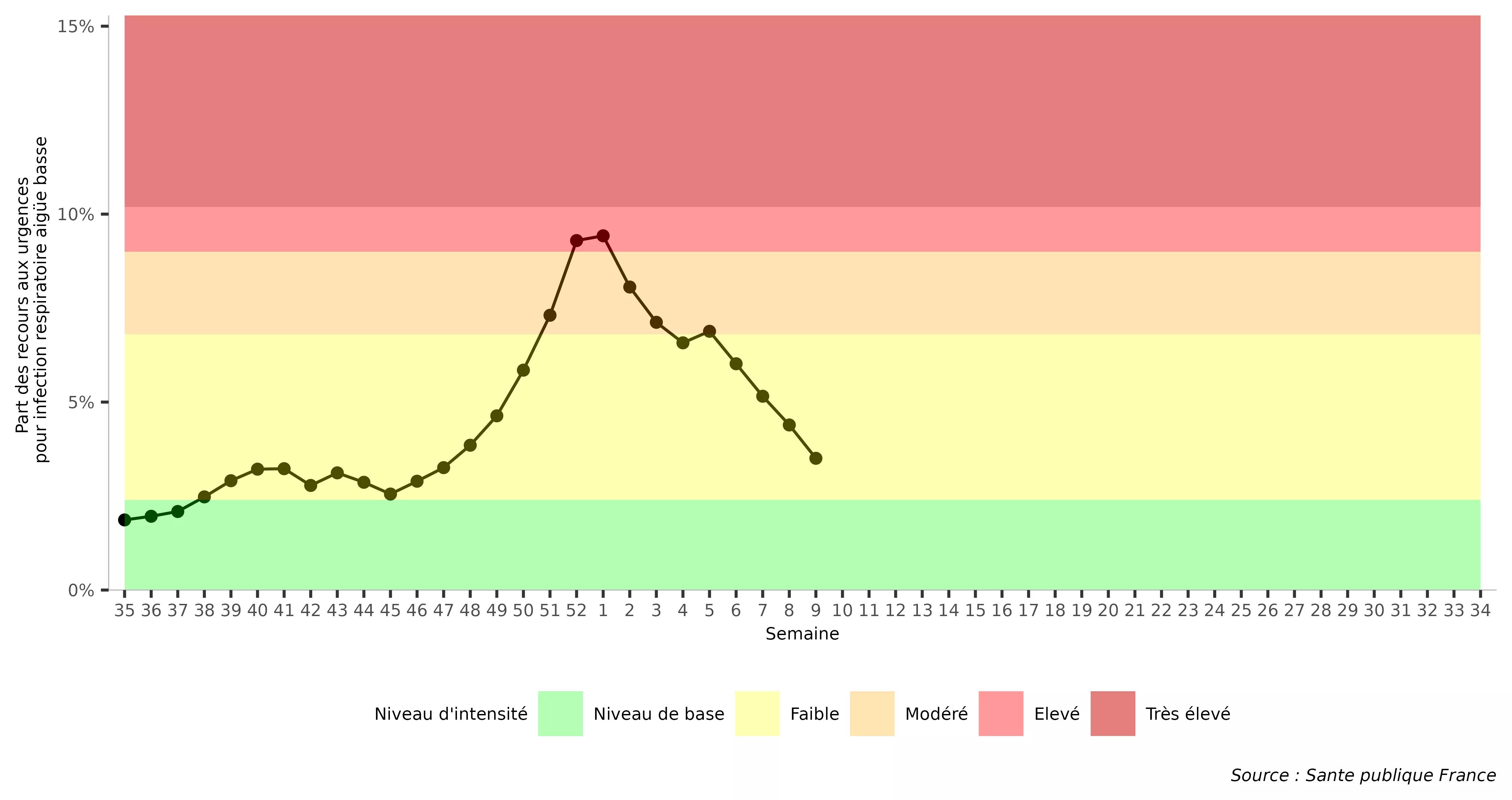 - Déclenchement : dès le passage du niveau “intensité modérée” (fond orange sur le graphique) de l’indicateur régional « IRA basses » (Oscour®), ou en cas d’entrée directe en intensité élevée/très élevée (fond rose ou rouge).