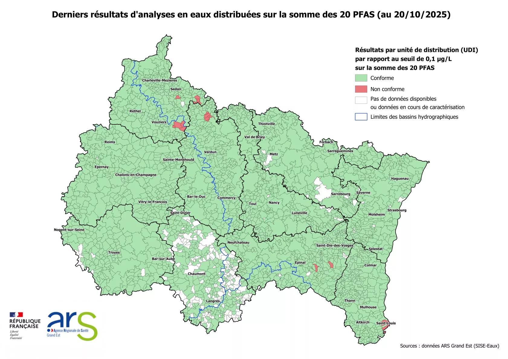 En 2023 et 2024, les campagnes exploratoires réalisées par l’ARS Grand Est sur l’eau du robinet ont concerné 366 réseaux du Grand Est soit 12,1 % des réseaux du Grand Est représentant 59,5% de la population du Grand Est. Les résultats de ces campagnes ne reflètent pas la qualité moyenne de l’eau potable en Grand Est, car certains points ont été ciblés et priorisés du fait d’une contamination potentielle de l’environnement mise en évidence par d’autres organismes.